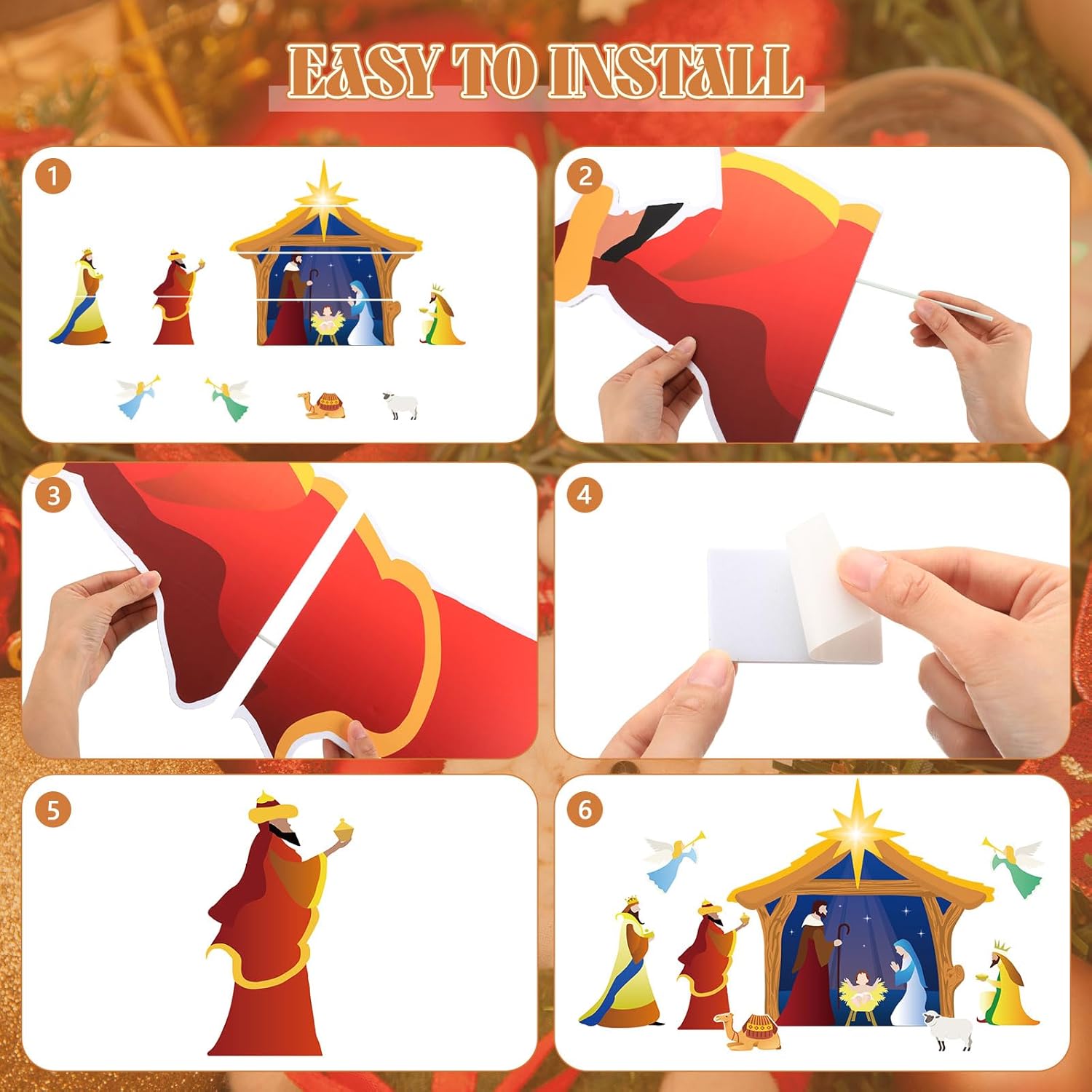 Features: This nativity scene outdoor yard stakes featuring a holy nativity scene, makes a nice Christmas gift. It enhances your yard as a delightful Christmas decoration nativity scene. The nativity scene outdoor yard stakes commemorate Jesus' birth, adding a festive and welcoming touch to your outdoor space. It also includes lights for an illuminated nativity scene display. Specifications: Material: double sided card paper Color: as shown in the picture Size: as pictures show Package includes: 8 x Christmas yard signs with stakes 2 Rolls LED string lights Notes: Manual measurement, please allow slight errors on size. The color may exist a slight difference due to different screen displays. Warm reminder: For safety and longer life, always fully unfold the bulbs before use. Bundling them can cause overheating and hazards.